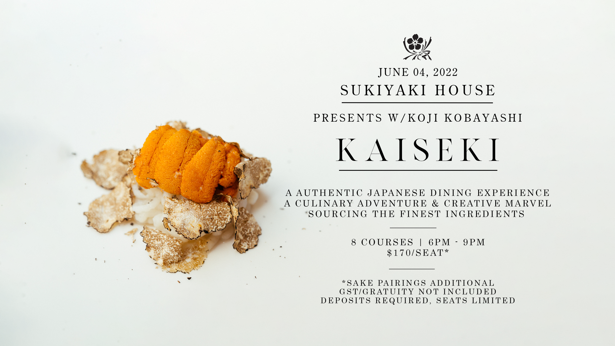 We are proud to announce the return of our kaiseki dinners, coming on Saturday, June 04, 2022. Known as 'kaiseki' - a traditional fine-dining, multi-course meal which focuses on simplicity and seasonality to best showcase the natural flavours of the produce. Chefs use local ingredients which represent the seasons, presented in a way that is beautiful but purposeful; where each course uses a different cooking technique (ex. soup, appetizer, grilled course, steamed course, among many others). Koji Kobayashi has spent a decade long perfecting this craft in Osaka and will bring a taste of Japan's summer here to Calgary’s own Sukiyaki House.